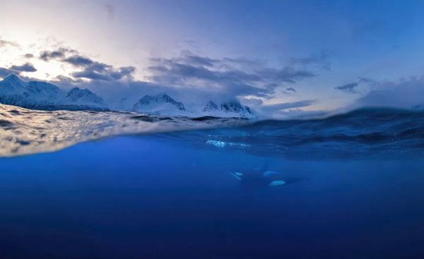 走進展廳,仿佛走進了海洋的世界,這里有海浪的聲音,有鯨魚的叫聲,有五彩繽紛的深海生物,更有巨幅懸空垂下的中國風海洋主題作品。觀眾可以看到迎面而來的抹香鯨、冰海的虎鯨、子行母隨的大翅鯨、乞討的鯨鯊、暗藏殺機的美洲鱷……這些精彩的視頻影像和攝影作品都是攝影家岳鴻軍幾十年來潛心于海洋攝影的創作成果展示。