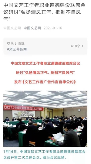 1月16日,中國文聯(lián)發(fā)布《文藝工作者廣告代言自律公約》(以下簡稱《自律公約》),引起文藝界積極反響和思考,引發(fā)社會(huì)各界廣泛關(guān)注和討論。