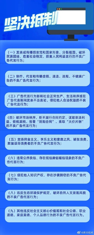 《自律公約》對九項(xiàng)不良廣告代言行為提出堅(jiān)決抵制 新華社制圖
